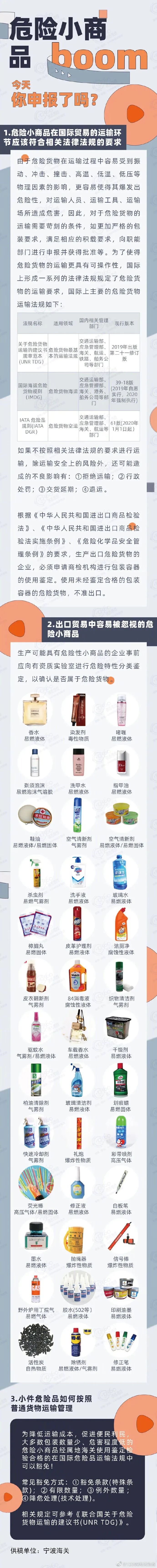 在出口贸易中容易被忽视的危险小商品有哪些?危险小商品在国际贸易的运输环节应该符合哪些法律法规的要求?小件危险物品如何按照普通货物运输管理?就让宁波海关来告诉你吧~
